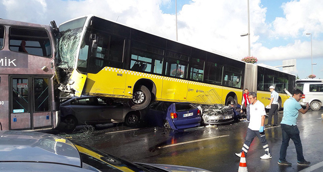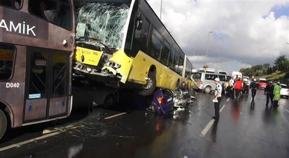 خرجت إحدى حافلات “المتروبوس” المتجهة من الطرف الآسيوي الى الطرف الأوروبي من اسطنبول عن المسار المخصص لها ، متسببة بحادث مروع بعد اصطدامها بـ4 سيارات خاصة على الجانب الآخر من الطريق، مما أدى الى وقوع 10 اصابات خفيفة، وقد هرعت سيارات الإسعاف الى المنطقة لإسعاف المصابين.