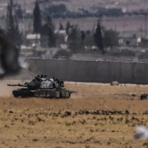 TOPSHOT - Birds fly near a Turkish tank coming from Syria during clashes between Turkish army and ISIS militants on September 4, 2016 at Elbeyli, in the southern region of Kilis. Ankara stepped up its fight against militants in Turkey and northern Syria with air strikes on Kurdish rebel positions in the restive southeast and IS extremists in northern Syria, security sources said on September 4, 2016. / AFP / BULENT KILIC (Photo credit should read BULENT KILIC/AFP/Getty Images)