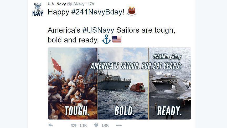 احتجت تركيا، على نشر البحرية الأمريكية أمس الجمعة، صورة تجسّد حربًا في القرن الـ 19، تظهر قوات مهزومة يعلوها العلم التركي، في إشارة إلى قوات الولايات التابعة للدولة العثمانية آنذاك.