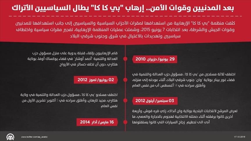 2 يوليو/تموز 2012 اختطف ثلاثة مسلحين “بي كا كا”، مسؤول حزب العدالة والتنمية في قضاء غور بينار بولاية “وان” جنوب شرقي البلاد، أثناء عودته إلى منزله، وأطلق سراحه في 14 أغسطس/آب من نفس العام.