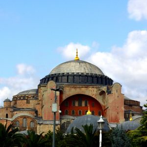 وكاتدرائية آيا صوفيا شيدت عند مدخل مضيق البوسفور وتوج فيها الأباطرة البيزنطيون وحُوّلت إلى مسجد في القرن الخامس عشر بعد سقوط القسطنطينية بأيدي العثمانيين في 1453.