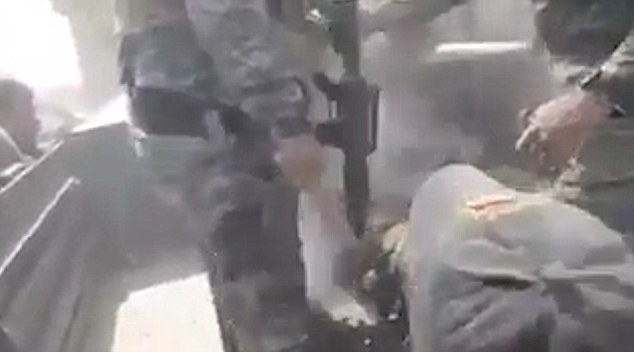 ويمكنك سماع صوت الشاب المغطى بالدماء يصرخ من الألم المبرح، نتيجة ضرب القوات المستمر له، في حين يقف آخرون حوله كي يصوروا الاعتداء على هواتفهم.