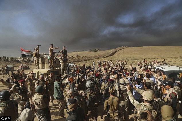 شوهد الجنود العراقيون اليوم حاملين أسلحتهم على أطراف مدينة الموصل، وذلك احتفالاً بانحسار تواجد داعش في المدينة.