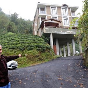 قام “صدري كوبوز” مواطن تركيّ في ولاية “ريزا” شمال البلاد ببناء بيتٍ من 3 طوابق، والغريب في الأمر أنّ البيت يقوم فوق أعمدةٍ مرتفعة عن الأرض التي هي الطريق المروري العام. والسبب في ذلك صعوبة البناء فوق الأرض مباشرة هناك.
