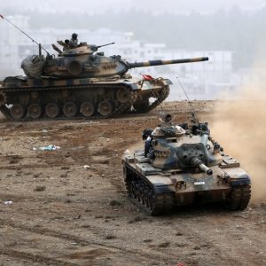 Turkish army tanks manoeuver as Turkish Kurds watch over the Syrian town of Kobani from atop a hill near Mursitpinar border crossing in the southeastern Turkish town of Suruc in Sanliurfa province October 11, 2014. A senior Kurdish militant has threatened Turkey with a new Kurdish revolt if it sticks with its current policy of non-intervention in the battle for Kobani. Kurdish forces allied to the Kurdistan Workers' Party (PKK), the People's Defence Units (YPG), are fighting against Islamic State insurgents attacking Kobani close to the Turkish border. Turkey is reluctant to open its border to allow arms to reach the out-gunned Kurds. REUTERS/Umit Bektas (TURKEY - Tags: CIVIL UNREST MILITARY CONFLICT POLITICS)