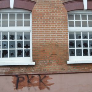 وأوضح أن المعتدين أقدموا على كسر نوافذ المسجد، وكتابة شعارات مناصرة لـ “بي كا كا” الإرهابية على جدرانه.