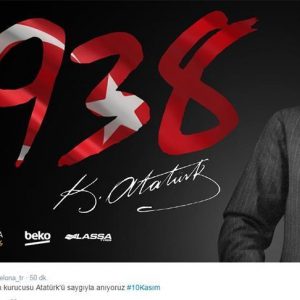 نشر نادي برشلونة الإسباني اليوم الخميس رسالة بمناسبة الذكرى الـ78 لوفاة مؤسس الجمهورية التركية، مصطفى كمال أتاتورك.