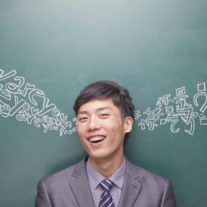 Portrait of young businessman in front of black board with Chinese and English script