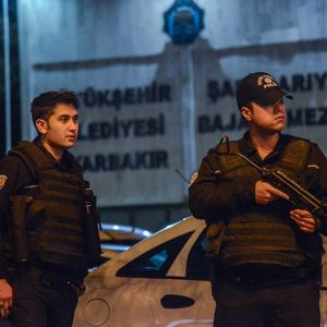 Armed Turkish anti riot police officers stand in front of the Diyarbakir's municipality headquarters on October 25, 2016 in Diyarbakir. The two co-mayors of Diyarbakir, the biggest Kurdish-majority city in southeast Turkey, have been arrested as part of a "terrorism" enquiry, security officials said. There was a heavy police presence around the town hall following the arrests of Gultan Kisanak and Firat Anli, who together lead a city that has been rocked by clashes between security forces and members of the outlawed Kurdistan Workers' Party (PKK). / AFP / ILYAS AKENGIN (Photo credit should read ILYAS AKENGIN/AFP/Getty Images)