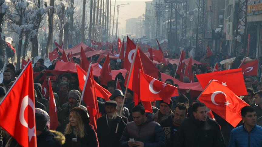 ورغم البرد القارس في ولايتي وان وهكاري، جنوب شرقي البلاد، إلّا أنّ مئات المواطنين تجمعوا في الساحات والميادين، وأدانوا الممارسات الإرهابية لمنظمة “بي كا كا” ورفعوا الأعلام التركية وهتفوا بالوحدة والتآخي.