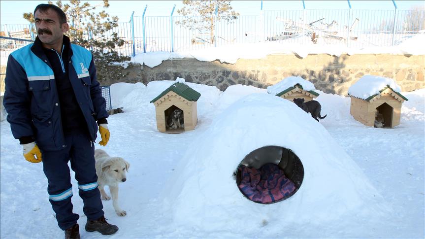وجدت بلدية أرضروم شمالي تركيا، حلا لوقاية حيوانات الشوارع من البرد القارص والثلوج اللذان يميزان شتاء المدينة، يتمثل في بناء بيوت لهم تشبه منازل الإسكيمو المصنوعة من الجليد.