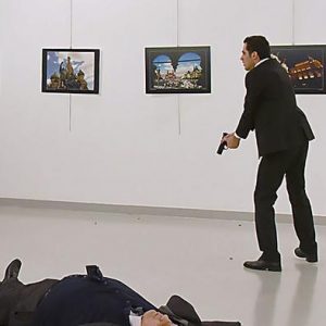 EDITORS NOTE: Graphic content / This picture taken on December 19, 2016 shows Andrei Karlov (L), the Russian ambassador to Ankara, lying on the floor after being shot by Mevlut Mert Altintas (R) during an attack during a public event in Ankara. A gunman crying "Aleppo" and "revenge" shot Karlov while he was visiting an art exhibition in Ankara on December 19, witnesses and media reports said. The Turkish state-run Anadolu news agency said the gunman had been "neutralised" in a police operation, without giving further details. / AFP / Sozcu daily / Yavuz Alatan (Photo credit should read YAVUZ ALATAN/AFP/Getty Images)