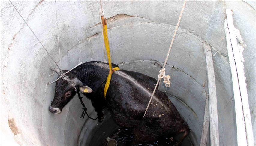 وحضرت فرق الإطفاء على الفور، وتمكنت بمساعدة الأهالي من انتشال البقرة بواسطة ربطها بذراع جرافة.