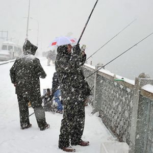 هواة صيد الأسماك في اسطنبول مستمرون في هوايتهم رغم العاصفة الثلجية