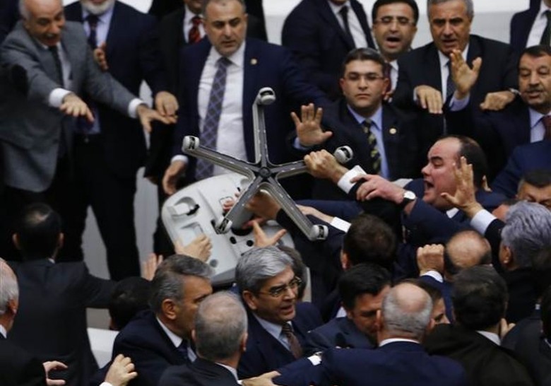 وقال موقع سي إن إن تورك إن أعضاء البرلمان تصارعوا بالكراسي والمزهريات التي كانت تزين القاعة.