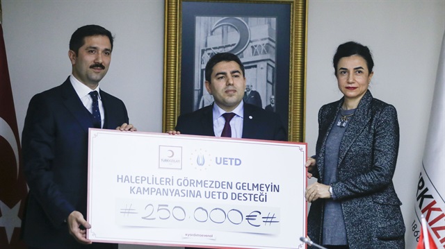 سلم اتحاد الديمقراطيين الأتراك الأوروبيين “UTED”، اليوم الإثنين، شيكاً بقيمة 250 ألف يورو إلى جميعة الهلال الأحمر التركي بهدف مساعدة النازحين من الأحياء المحاصرة في مدينة حلب شمالي سوريا.