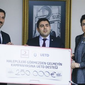 سلم اتحاد الديمقراطيين الأتراك الأوروبيين “UTED”، اليوم الإثنين، شيكاً بقيمة 250 ألف يورو إلى جميعة الهلال الأحمر التركي بهدف مساعدة النازحين من الأحياء المحاصرة في مدينة حلب شمالي سوريا.