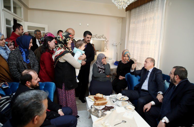 وعلى خلفية قراءته لليافطة، قبل أردوغان الدعوة التي وجهت إليه، فصعد إلى المنزل، حيث شرب الشاي مع سكانه، ليتناول فيما بعد الطعام معهم.