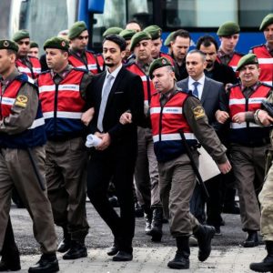 People, mainly Turkish soldiers, accused of trying to assassinate Turkish President during the July coup attempt, are escorted by security forces towards the courthouse in Mugla, western Turkey, on February 20, 2017. The trial opened on February 20, of almost 50 suspects accused of plotting to assassinate President Recep at a luxury Aegean hotel on the night of the botched July 15 coup. / AFP / BULENT KILIC (Photo credit should read BULENT KILIC/AFP/Getty Images)