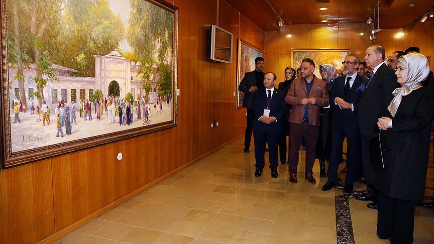 و بحسب الأناضول , تجول اردوغان في قاعة المعرض، مع عقيلته أمينة، واطلع على بعض اللوحات الفنية للرسام التركي.