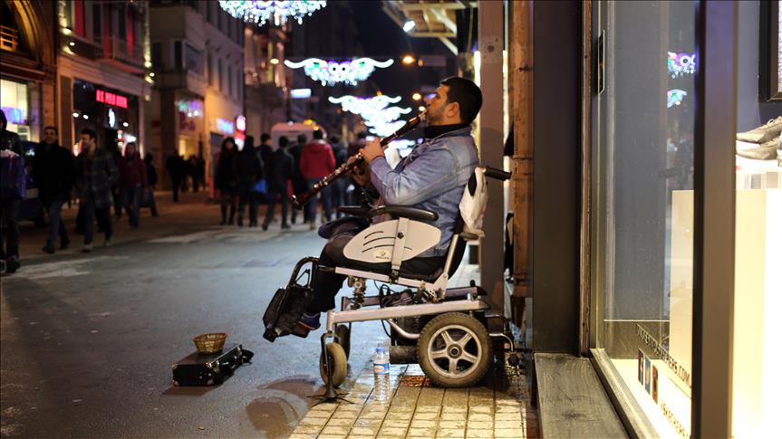 يعتمد “حكمت طرقش”، المعاق التركي، في كسب قوت أسرته على العزف على آلة “الكلارينيت”، بشارع الاستقلال وسط إسطنبول.