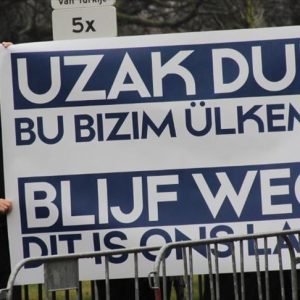 ورفع زعيم الحزب “خيرت فيلدرز” لافتة أمام السفارة، كُتب عليها باللغتين الهولندية التركية “لا تقترب، هذا بلدنا”.