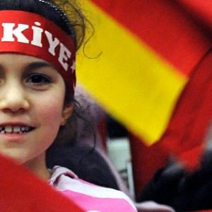 Ein Mädchen schwenkt am Sonntag (27.02.2011) in Düsseldorf in der ISS Arena vor der Rede des türkischen Ministerpräsidenten Erdogan die deutsche, die türkische und die Europafahne. Er will sich zum Thema Integration äußern. Mit Äußerungen dazu hat Erdogan schon häufiger Aufsehen erregt. So verlangte er vor drei Jahren von seinen Landsleuten in der Kölnarena, sich nicht zu stark anzupassen. Foto: Henning Kaiser dpa/lnw +++(c) dpa - Bildfunk+++