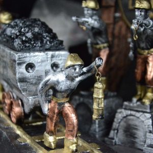 ومن بين هذه المنحوتات، ترى تماثيل لعمال وهم يقودون عربات الفحم حاملين بأيديهم الفوانيس، وساعات صنعها من أحجار الفحم.