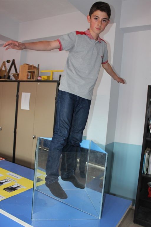 صمم تلميذ تركي في ولاية قسطموني شمالي تركيا، صندوقًا، يوحي للناظرين إليه أن الشخص يقف في الهواء عندما يدخل قدميه داخله.