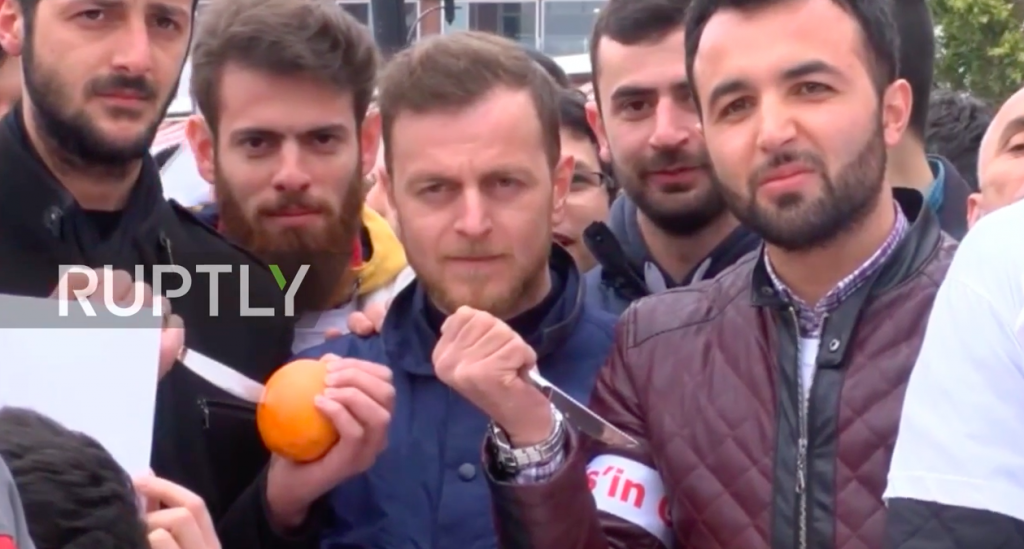 حيث قام المتظاهرون بجلب كميات كبيرة من البرتقال وقاموا بعصرها ثم شربها كتعبير غضب عن الإجراءات الأخيرة للسلطات الهولندية بحق الأتراك.