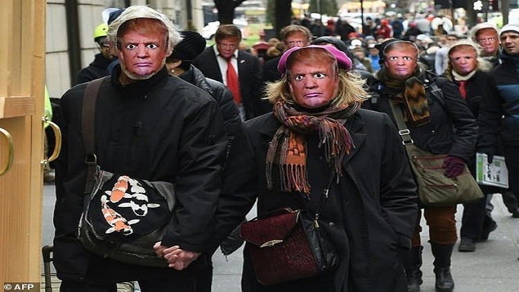 شارك عشرات الأشخاص أمس في مسيرة احتفالية بمناسبة كذبة الأول من أبريل في نيويورك مرتدين أقنعة تشبه وجه دونالد ترامب، وساروا خلف دمية بشكل الرئيس الأمريكي أجلسوها على مرحاض.