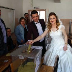 وذهب العروسان اليوم الأحد، إلى لجنتهما الانتخابية في ولاية “قرقلر إيلي” غربي البلاد بثياب الزفاف، حيث أدليا بصوتيهما.