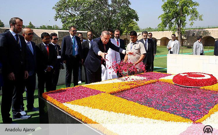 وتوجه أردوغان للضريح، بعد أن استقبله الرئيس الهندي براناب موخرجي برفقة رئيس وزرائه ناريندا مودي، في القصر الرئاسي بالعاصمة.