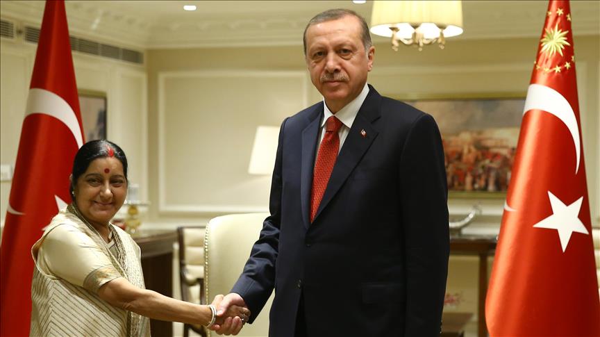 استقبل الرئيس التركي، رجب طيب أردوغان، وزيرة الخارجية الهندية سوشما سواراج، في الفندق الذي يقيم به بالعاصمة الهندية نيودلهي، اليوم الاثنين.