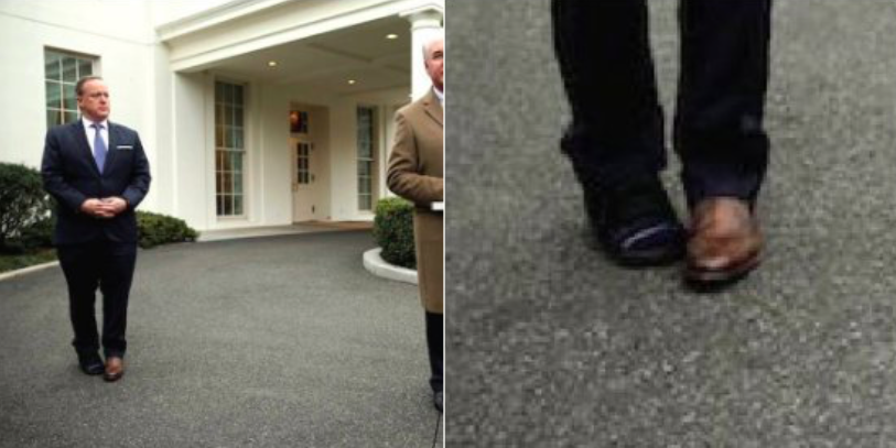 خرج المتحدث باسم البيت الأبيض شون سبايسر يرتدي فردتي حذاء مختلفتين للصحفيين، إحداهما بنية اللون والأخرى سوداء.