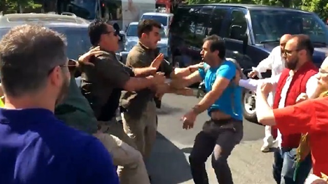 #شاهد مؤيدي بي كا كا الارهابية يعتدون على مؤيدي الرئيس اردوغان في واشنطن٬ وحرس الرئيس اردوغان يتدخل.