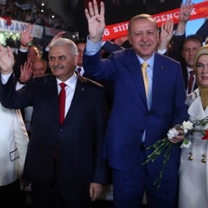 وكان في استقبال أردوغان لدى وصوله، رئيس الوزراء، رئيس حزب العدالة والتنمية، بن علي يلدريم وطاقمه الوزراي، إضافة إلى نواب ومسؤولي الحزب.