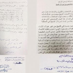 وتابعت :”ومن هؤلاء الأبناء الأربعة فقط وأبنائهم وأحفادهم تنحصر ذرية الشيخ. أما من يدّعي أنه يعود بنسبه إلى الشيخ من غير هؤلاء الأبناء الأربعة داخل المملكة أو خارجها، فهي دعوى باطلة كاذبة ومختلقة، ولا تمت للحقيقة بأية صلة، كأمير إحدى الدول الخليجية الذي قام ببناء مسجد باسم الشيخ محمد بن عبدالوهاب في بلده، مدعياً أنه جده رغم أن من يتولون الإمامة والخطابة في هذا المسجد لا يمتون بصلة لنهج الشيخ محمد بن عبدالوهاب”.