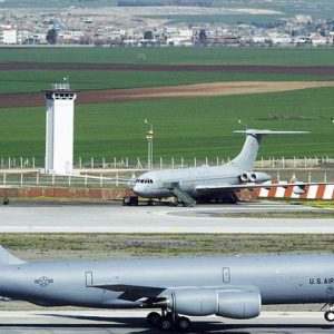 INCIRLIK AIR FORCE BASE, TURKEY - MARCH 7: A KC-135 refueling jet slides in front of a control tower during takeoff March 7, 2003 at Incirlik Air Force Base in Turkey. Activity at Incirlik, one of the Air Force's main bases in the region, is increasing as the military prepares for a possible war in Iraq. (Photo by Chris Hondros/Getty Images)