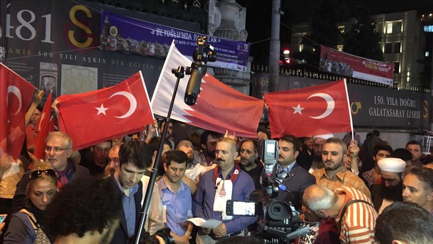 وتجمع العشرات من الناشطين العرب والأتراك أمام ثانوية “غلطة سراي” في شارع “الإستقلال” بمنطقة “تقسيم”، قلب إسطنبول النابض، رافعين لافتات وأعلام قطر وتركيا، داعين إلى تحكيم العقل لحل الأزمة بالحوار ومطالبين برفع الأيدي عن قطر والتوقف عن حصارها.