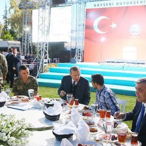 شارك الرئيس التركي رجب طيب أردوغان، اليوم الخميس، في مأدبة إفطار رمضانية مع أفراد الجيش وعوائل الشهداء في ولاية قيصري وسط البلاد.
