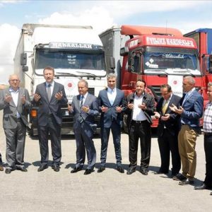 وجرت مراسم توديع الشاحنات أمام مبنى مديرية المنطقة الصناعية بحضور والي المدينة سليمان تابسيز وعدد من مسؤولي الولاية.