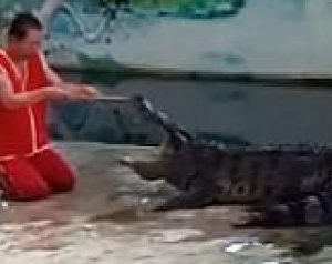 ويظهر الرجل أولاً وهو ينحني أمام التمساح ويلاعبه بعصا من الخشب، فيما يحاول إدخال رأسه بين فكي الحيوان الشرس، كنوع من ألعاب السيرك، لتحدث الكارثة بعد ذلك بقليل.