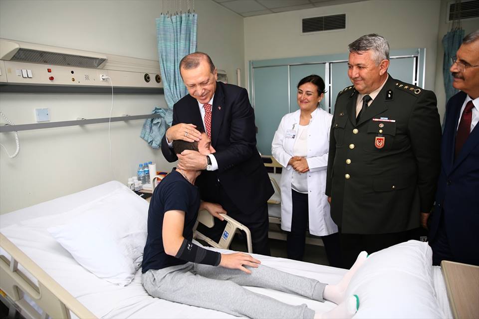 وزار أردوغان المصابين في مشفىً للمعالجة الفيزيائية في أنقرة، بينهم رئيس دائرة مكافحة الإرهاب بالمديرية العامة للأمن طورغوت أصلان، الذي تعرض لإصابة بليغة في الرأس، على يد الانقلابيين، في مقر قيادة الدرك.