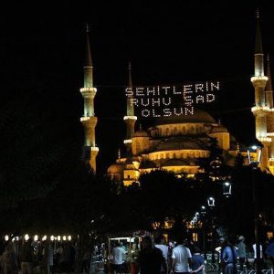 وفي لافتة المحيا في مسجد السلطان أحمد كتبت عبارة: “الخلود لأرواح الشهداء”.