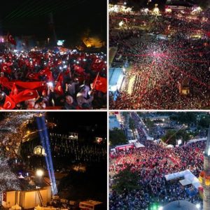 وبنفس السياق، نزلت الجماهير في مختلف الولايات بعموم البلاد إلى الميادين للمشاركة في اعتصامات “صون الديمقراطية”، حيث حمل المشاركون العلم التركي، ورددوا هتافات منددة بالانقلابيين وداعمة للديمقراطية.