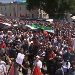 تظاهر آلاف من الأتراك والمسلمين في مدينة إسطنبول التركية، احتجاجا على الممارسات الإسرائيلية حيال المسجد الأقصى ونصرة للمرابطين فيه، وذلك عقب انتهاء صلاة الجمعة.