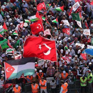 وعصّب المئات من المشاركين بالتجمع، رؤوسهم بالعلمين التركي والفلسطيني وشعارات التضامن مع القدس، مشددين على أن الانتهاكات الإسرائيلية بحق الأقصى “مرفوضة”.