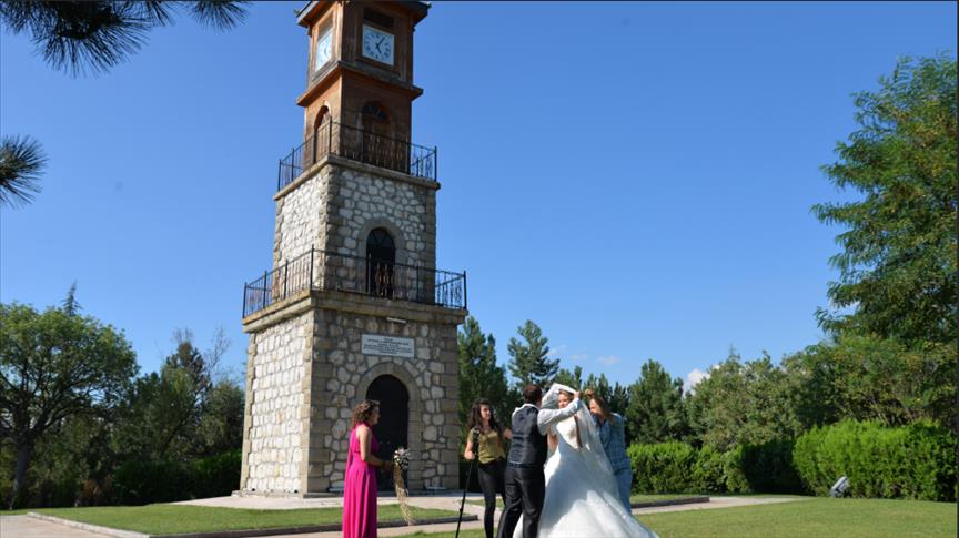أصبح برج الساعة التاريخي الذي أمر السلطان عبد الحميد الثاني ببنائه في مدينة بيلاجك غربي الأناضول التركي عام 1907، مكانا مفضلا لالتقاط صور الزفاف والمناسبات السعيدة.