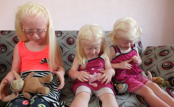 الشقيقات الثلاث “أيلول إدا” (7 أعوام) يارين (5 أعوام) وميراي (3 سنوات)، اللاتي تلقبن بـ “ملائكة بيضاء” لإصابتهن بمرض المهق، لا تستطعن النظر إلى الشمس منذ ولادتهن بسبب التأثير السلبي على عيونهن وجلودهن.